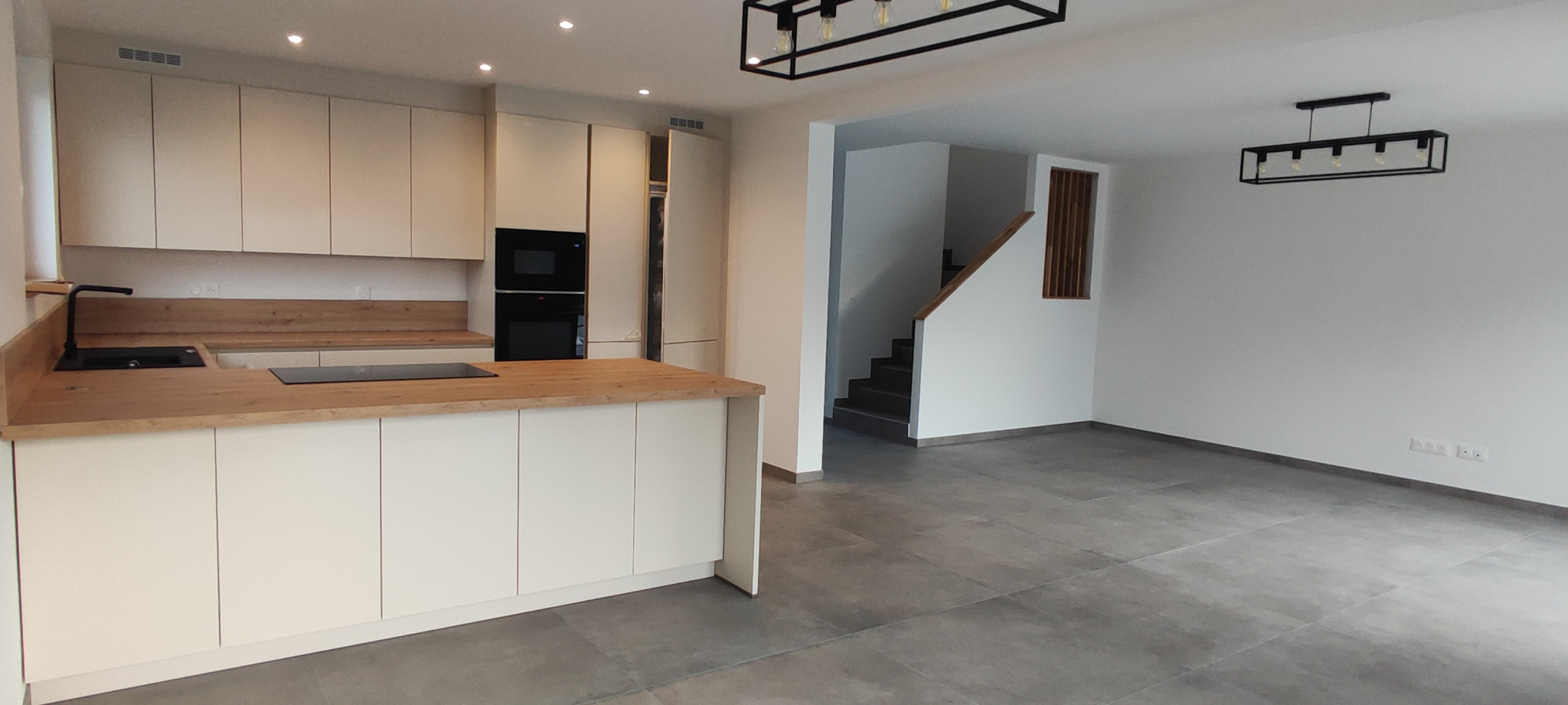 Au RDC: Une belle entrée de 9.59 m² avec placard /dressing /un séjour avec cuisine ouverte( entièrement équipée )de 59,63 m²
